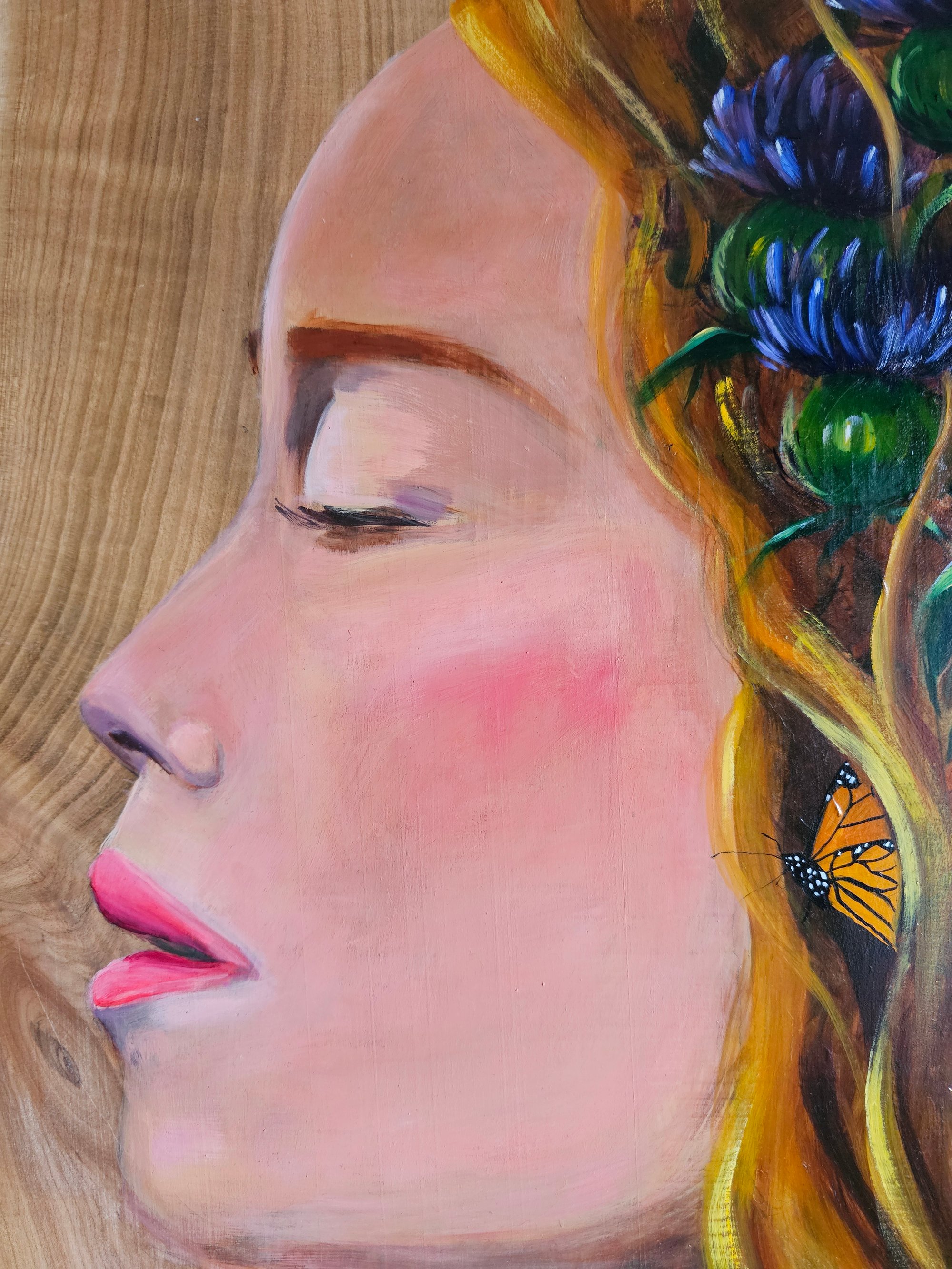 Stoic & hopeful. Herioc thistles entwine her hair, monarch butterflies carry her prayers in the wind.