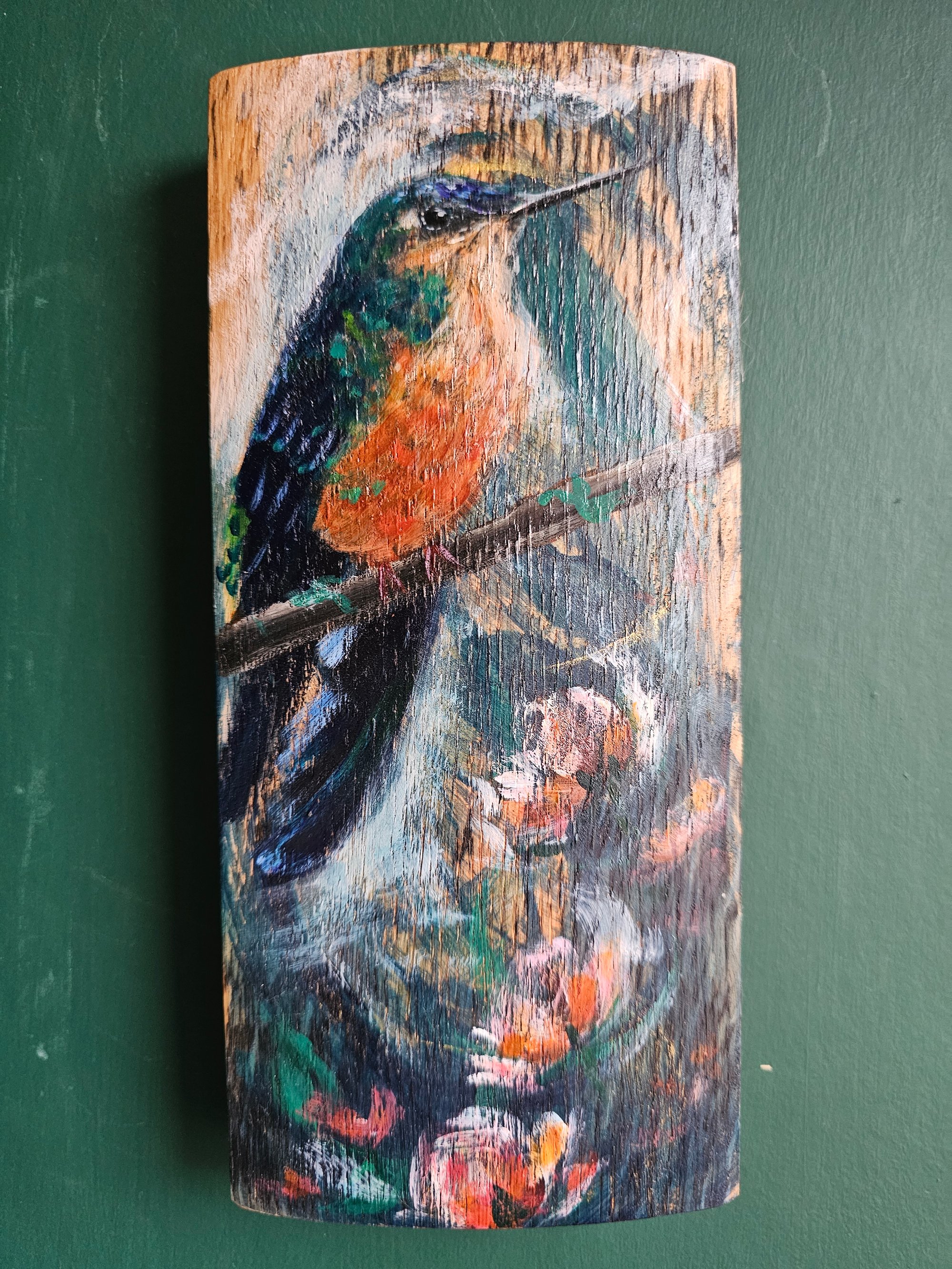 Hand painted with oil & acrylic on a section of oak whisky barrel wood.
