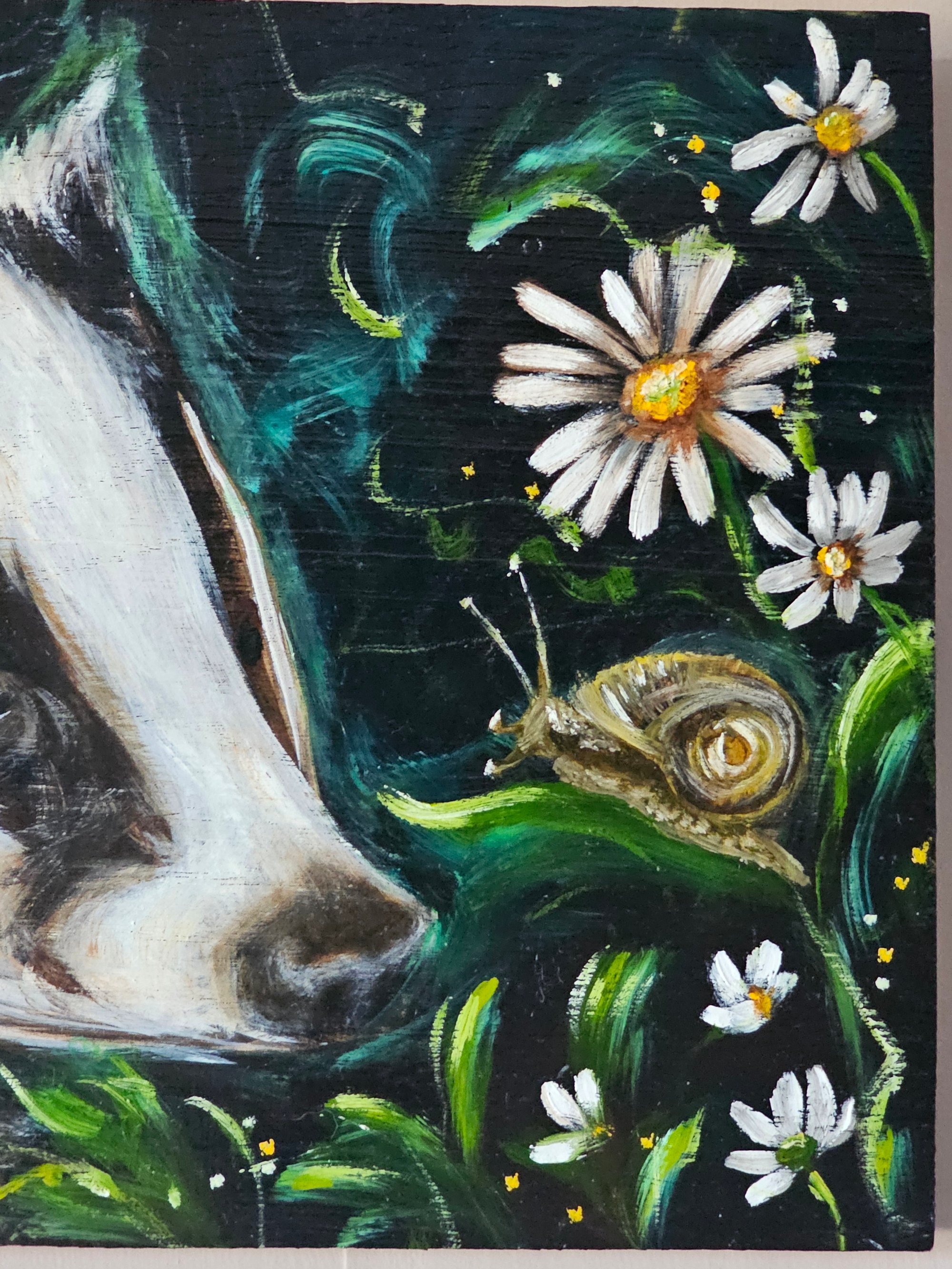 The daisy woods are bathed in moonlight, and badger pauses to say hello to his little friend snail.