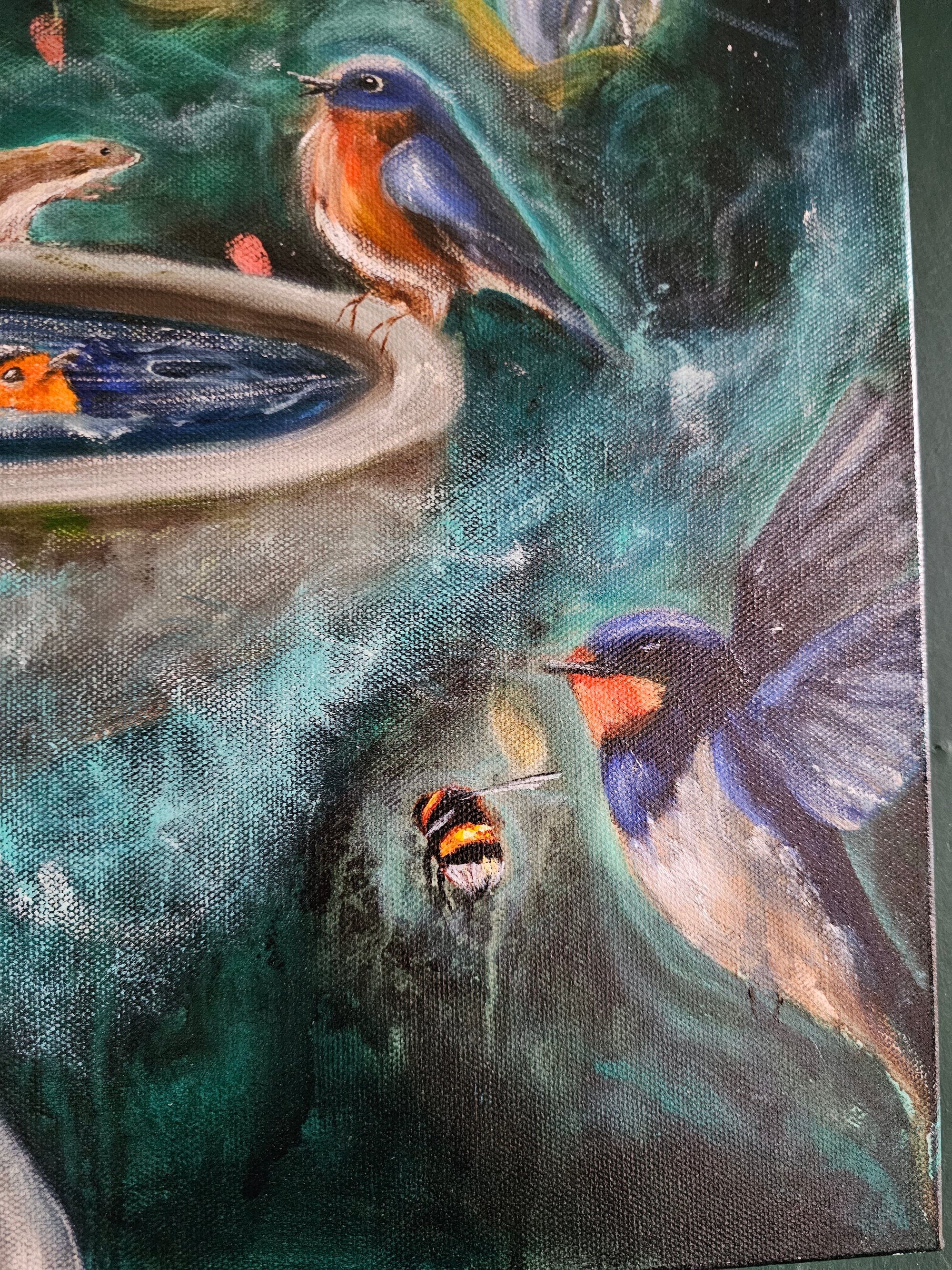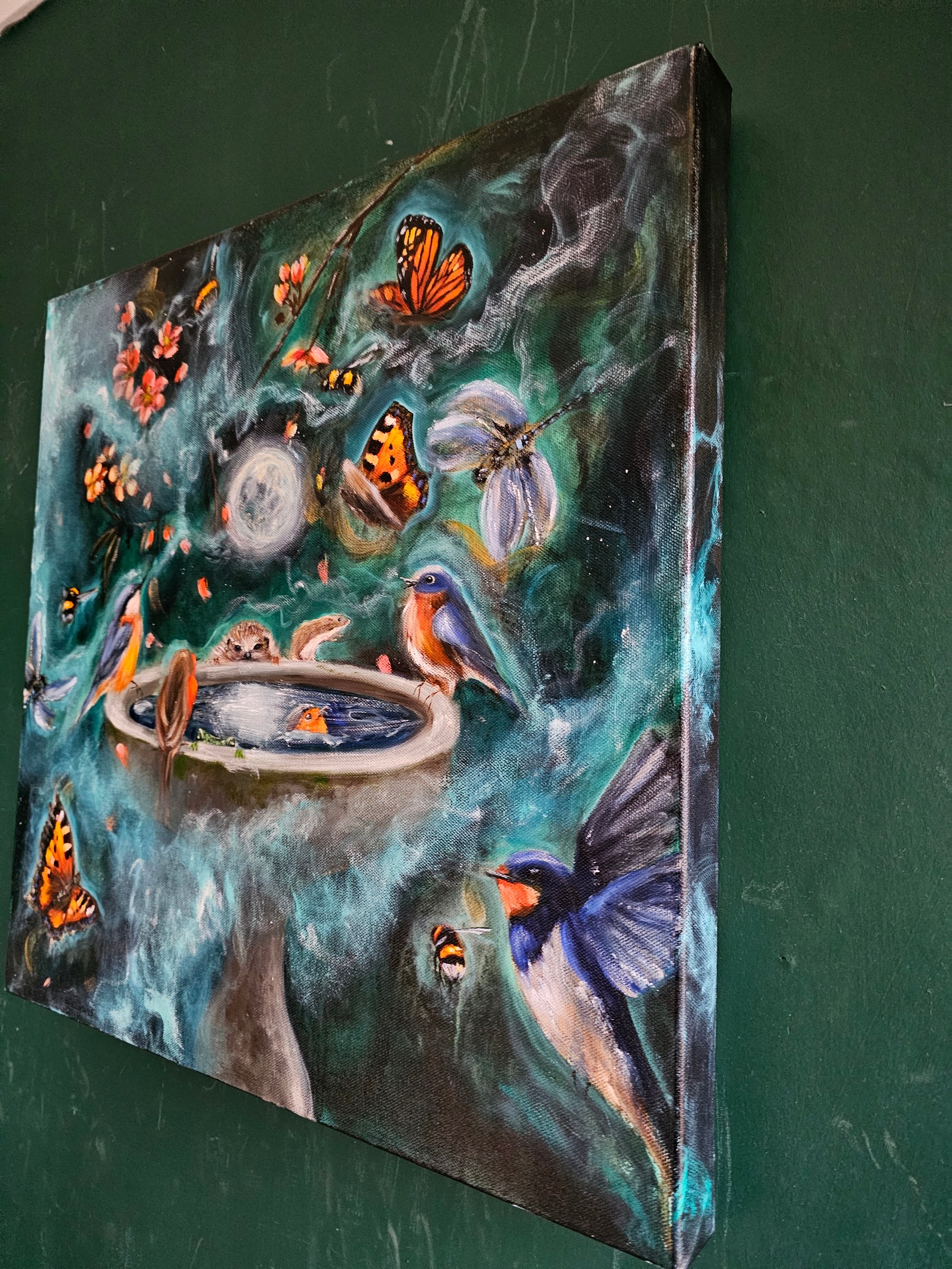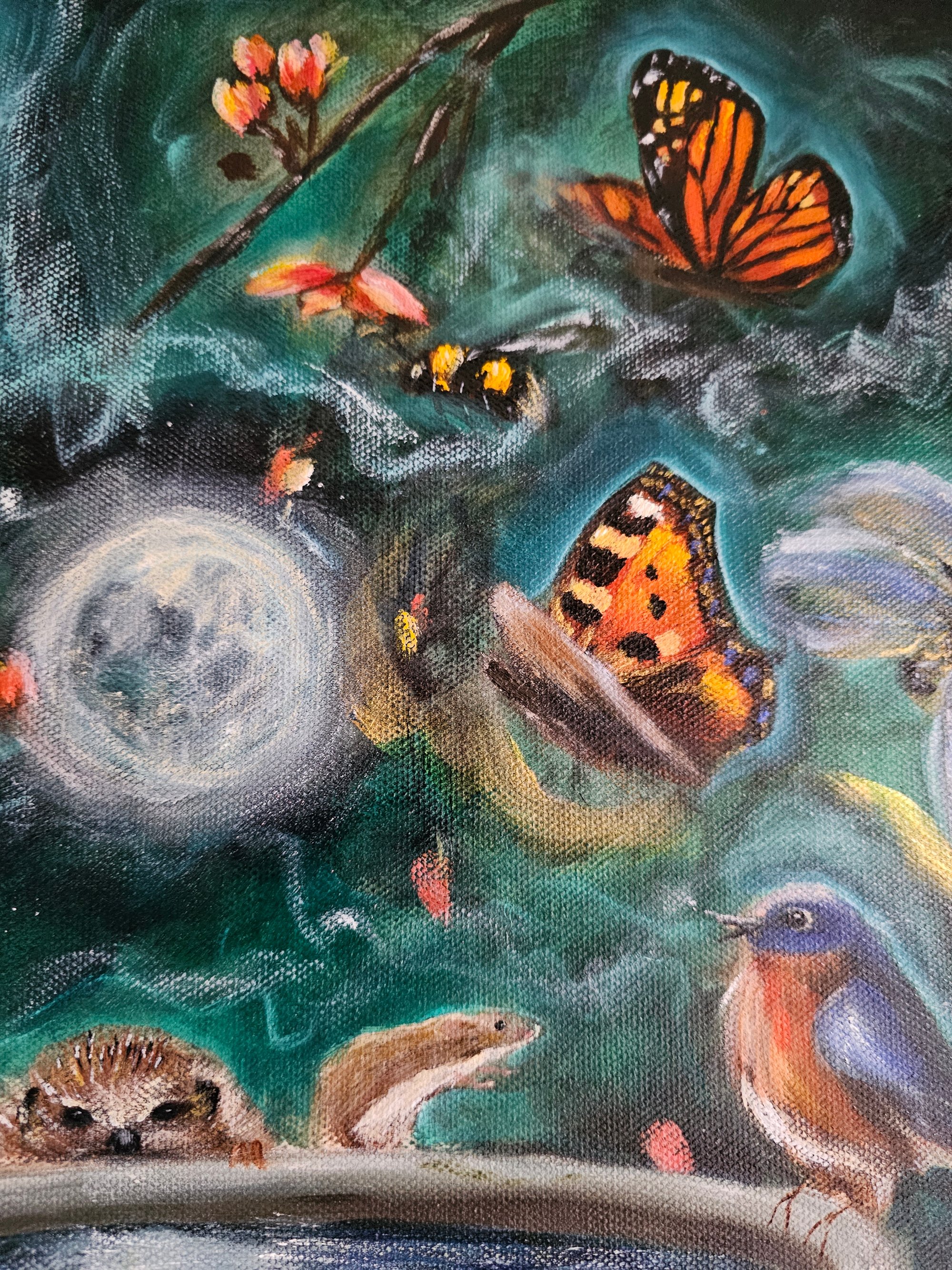 Pretty blossom glows in the background as swallows, dragonflies, bees, a mouse & other characters gather together in a sacred & joyful moment.