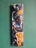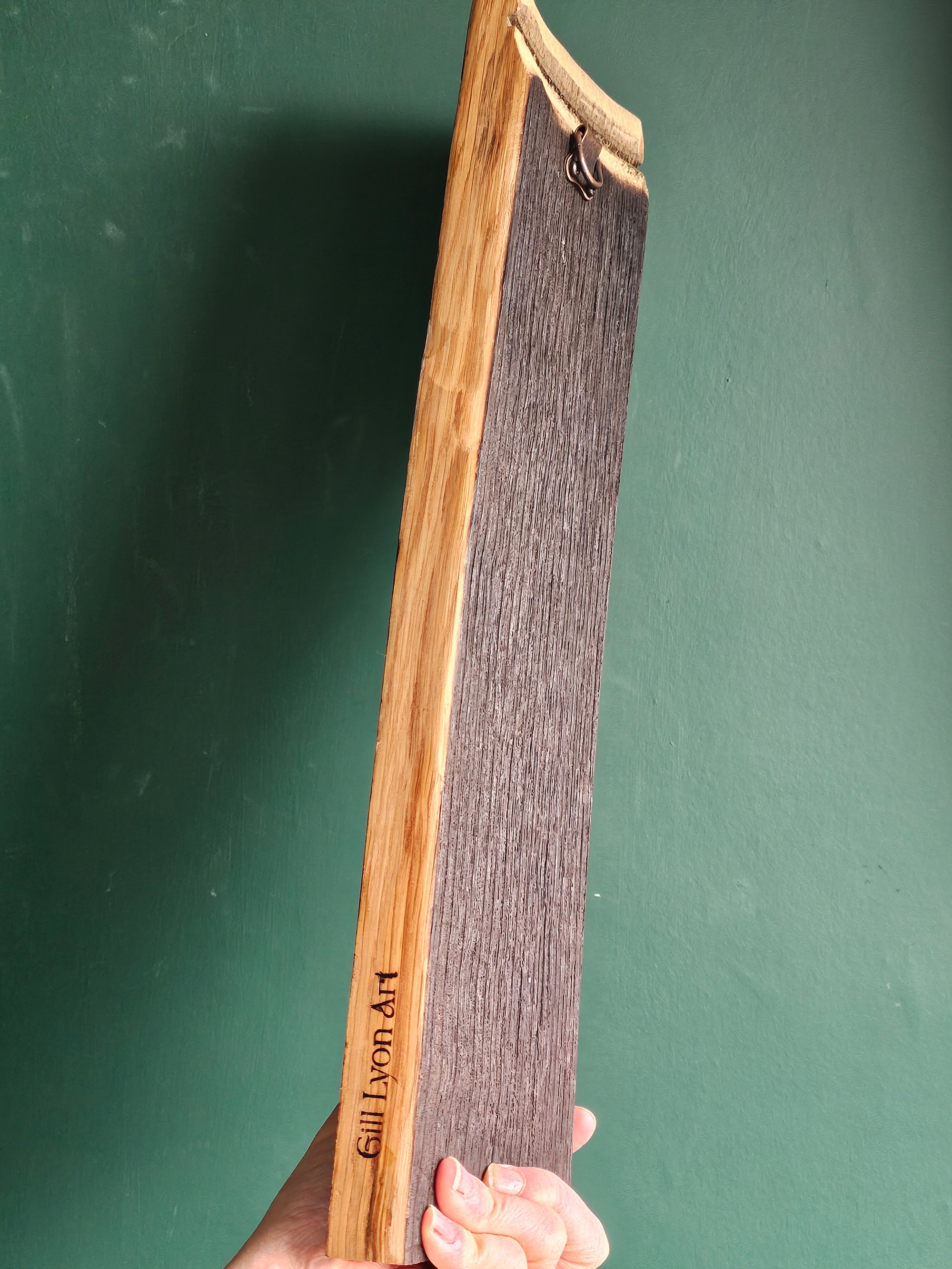Hand painted with oil & acrylic on a section of oak whisky barrel wood.