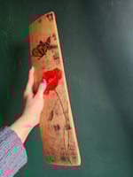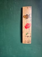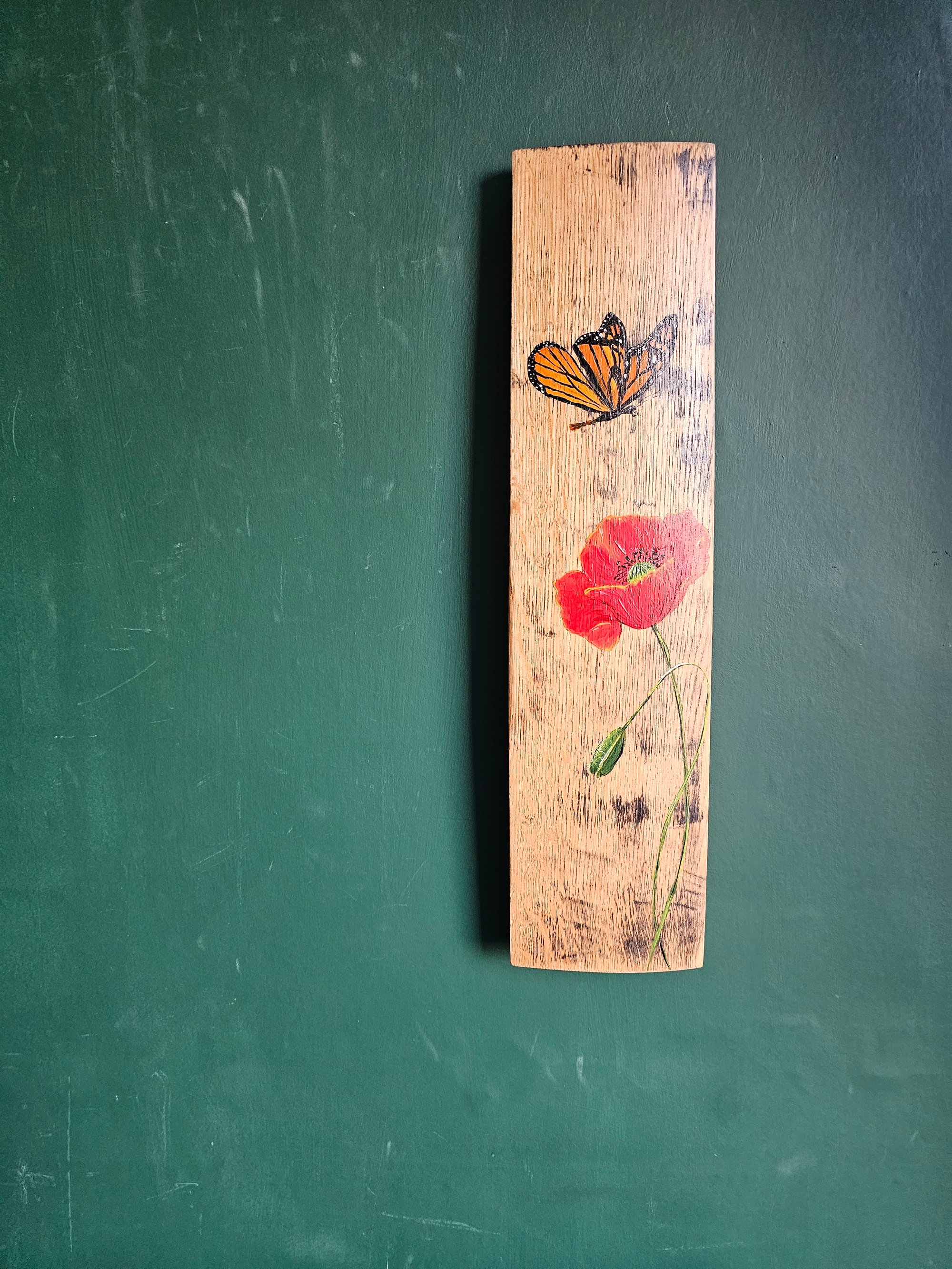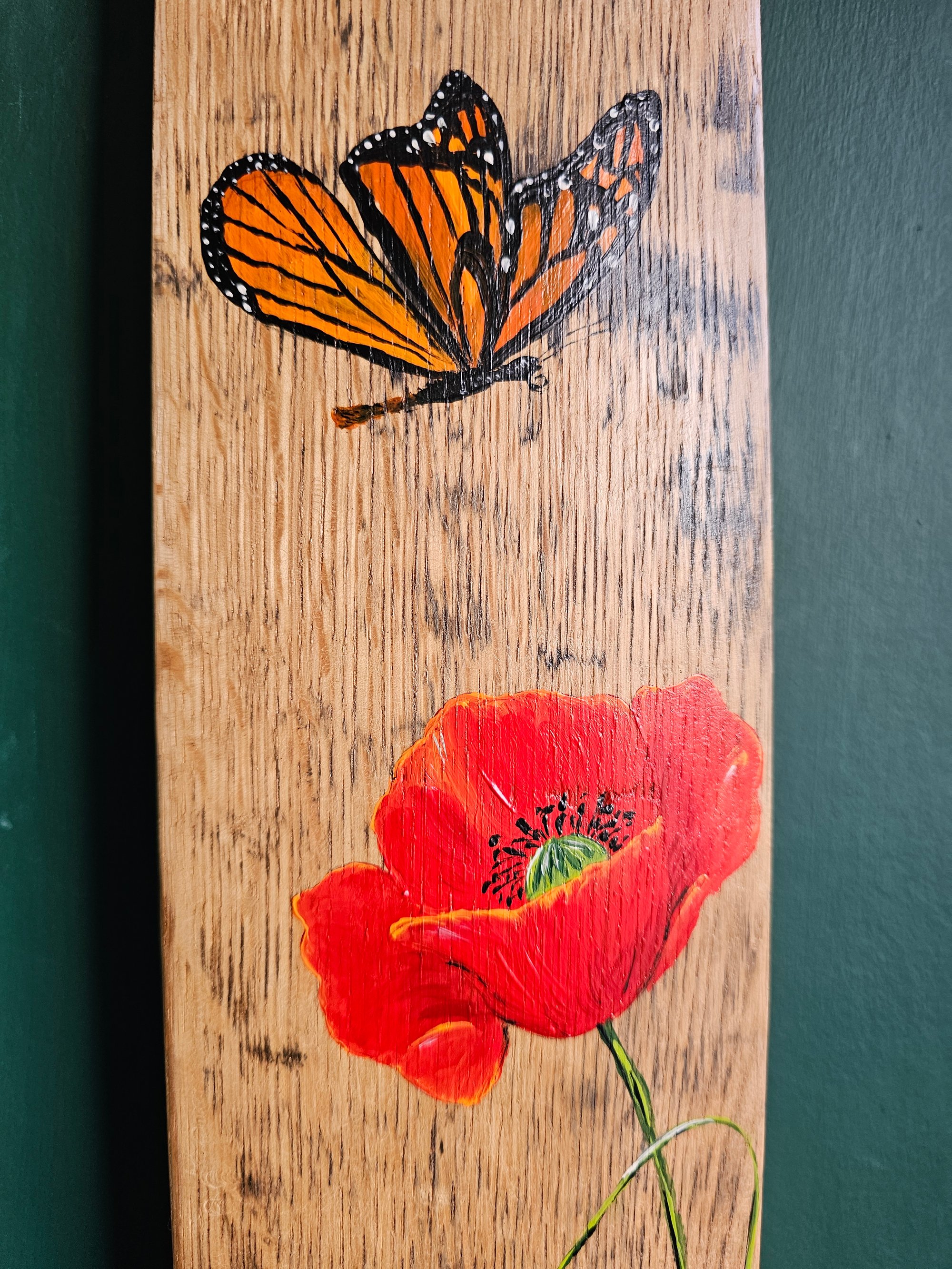 Hand painted with acrylic on a section of oak whisky barrel wood. This piece features a vibrant red poppy & monarch butterfly.