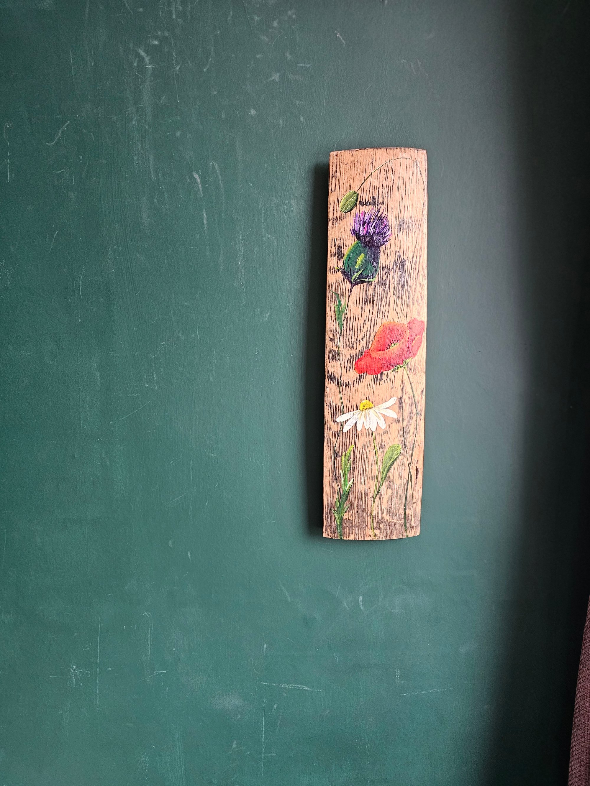 Hand painted with acrylic, featuring a Scottish thistle, wild red poppy & wild daisy on a section of oak whisky barrel wood.